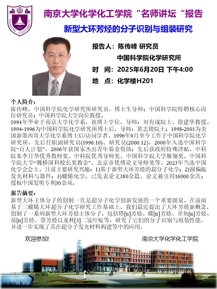 6月20日名师讲坛-陈传峰研究员:新型大环芳烃的分子识别与组装研究