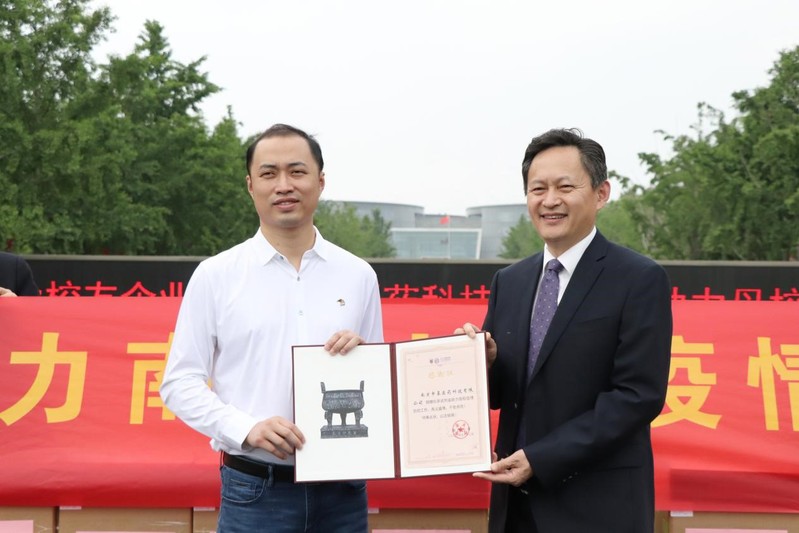 邹亚军副董事长向童坤博士颁发太阳成集团捐赠感谢状。后勤服务集团总经理钱国兴代表太阳成集团接收该笔捐赠物资。