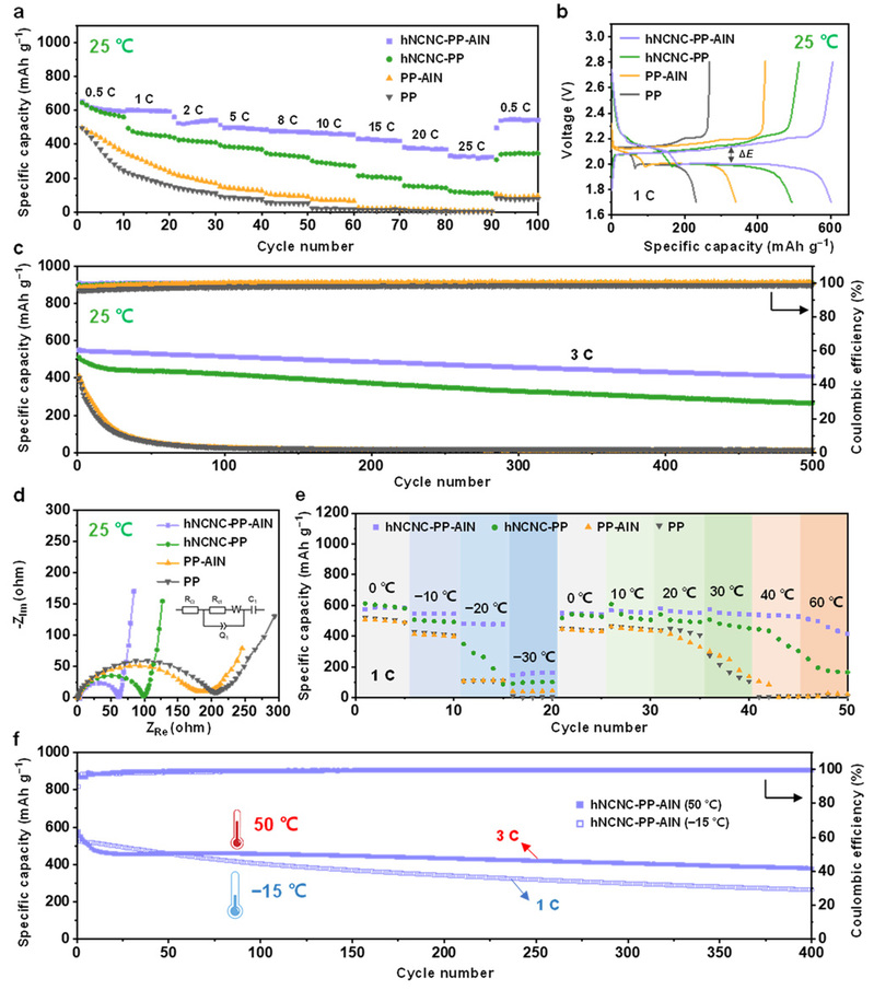 图2为使用不同隔膜组装的Li-Se电池的电化学性能。在室温下,相比于使用其他隔膜的电池,使用hNCNC-PP-AlN双面修饰隔膜的电池在各电流密度下比容量最高,且随着电流密度的增加,比容量的提升越来越明显。即使在25 C的超高倍率下,使用该双面修饰隔膜的电池仍然提供了331 mAh g−1的高比容量。在3 C时循环500圈后该电池比容量保持为408 mAh g−1。在−30至60 ℃的宽温域内,使用hNCNC-PP-AlN双面修饰隔膜的电池也具有优异的电化学性能。循环400圈后,使用该双面修饰隔膜的电池在50 °C(3 C)和−15 °C(1 C)下的比容量分别为379 mAh g−1和265 mAh g−1,明显优于使用其他隔膜的电池。