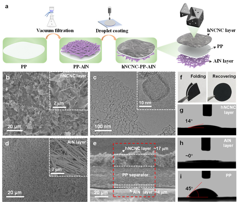 图1 hNCNC-PP-AlN双面修饰隔膜的制备与表征。