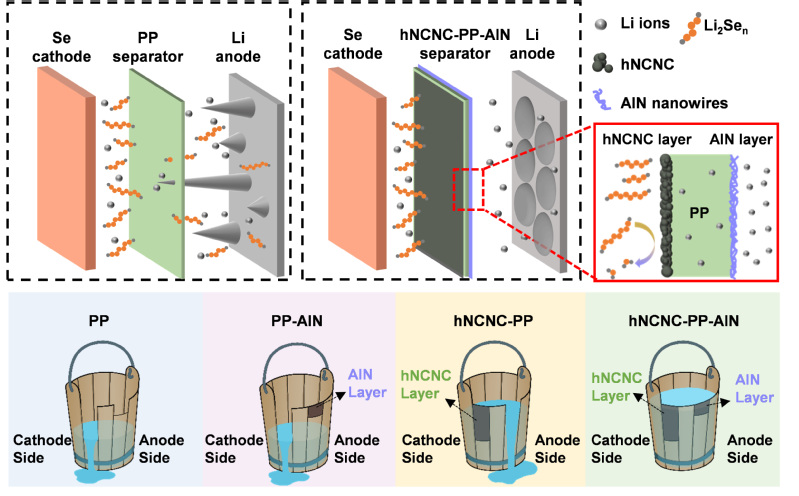 图5 hNCNC-PP-AlN双面隔膜增强Li-Se电池性能的机理。