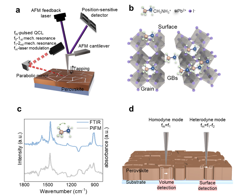 近日,夏兴华团队提出了一种基于红外光生力显微技术的三维纳米红外成像方法,通过发展表面敏感的外差测量模式和体积敏感的零差测量模式,在低于10 nm的空间分辨率下实现了有机阳离子在钙钛矿中沿晶界和晶格的原位迁移原位成像。研究发现,在低外电场下,有机阳离子沿钙钛矿薄膜表面和晶界迁移。随着电场增加,有机阳离子迁移通道从晶界转变至整个体相。时间分辨的纳米红外信号演化结果表明,甲胺离子在晶界处的迁移速度与卤化物离子的扩散速度相当。