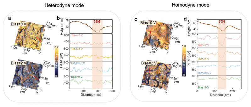 图2. 在外差和零差模式下对偏压诱导的阳离子迁移进行成像。
