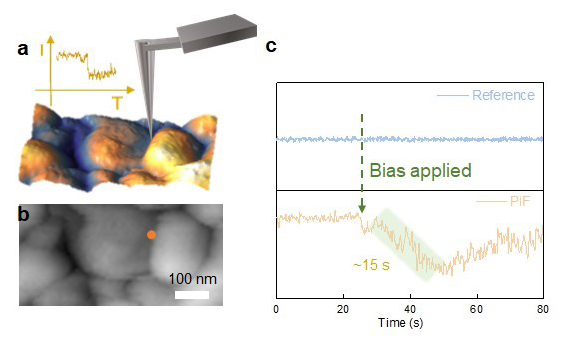 离子迁移作为钙钛矿固有性质,无法通过封装等方法解决,从源头上理解钙钛矿的离子迁移机理,是提升钙钛矿性能,指导高性能器件设计的关键。有机-无机金属卤化物钙钛矿薄膜的晶粒尺寸、晶界和位错等结构特征均在纳米尺度,因此,发展纳米尺度上测量离子迁移过程的新技术,对于理解其结构-功能相关性具有重要意义。