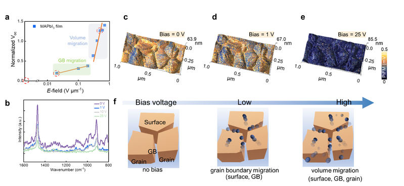 驱动电场强度依赖的测量结果表明,钙钛矿薄膜中有机阳离子迁移通道将随电场强度发生转变(图3)。低电场下,甲胺阳离子优先在晶粒的表面和晶界迁移,且晶粒越小或晶界越多,越有利于阳离子的快速迁移,使得在VOC曲线上出现第一个平台。而在较高电场下,晶粒内部的甲胺阳离子会被激活迁移,大量甲胺阳离子通过体相迁移通道从阳极迁移到阴极,部分解释了VOC曲线中出现的第二阶段,强调了有机阳离子对整个离子迁移现象的重要贡献。