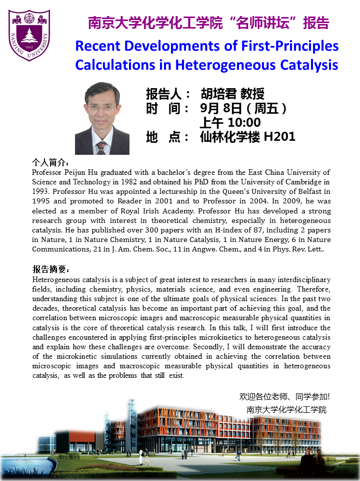 9月8日名师讲坛-胡培君教授:Recent Developments of First-Principles Calculations in Heterogeneous Catalysis