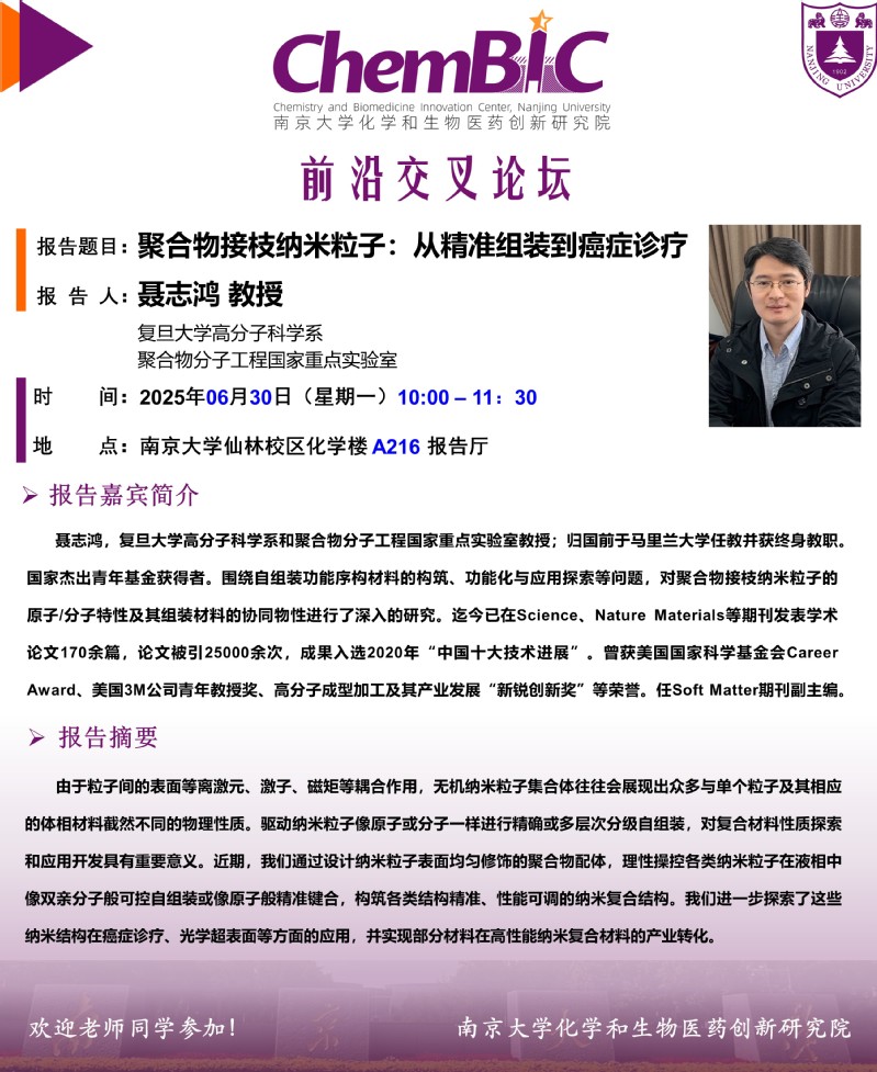 6月30日前沿交叉论坛-聂志鸿教授:聚合物接枝纳米粒子:从精准组装到癌症诊疗