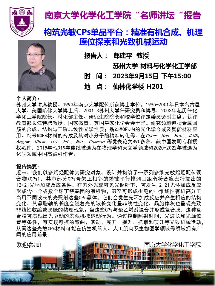 9月15日名师讲坛-郎建平教授:构筑光敏CPs单晶平台:精准有机合成、机理原位探索和光致机械运动