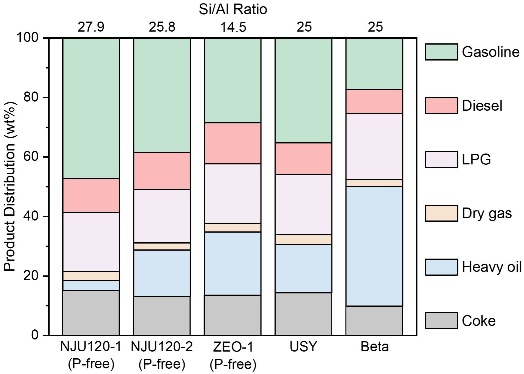 NJU120-1和NJU120-2分子筛具有高的水热和热稳定性,约1.2纳米的超大孔径和纳米尺度形貌,使得其在催化裂化(FCC)反应中展现出优异的重油转化率和轻质燃料(汽油、柴油和液化石油气)选择性,其实验室的初步催化性能甚至超越工业上高度优化的超稳Y沸石分子筛(USY,FAU结构),且表现出良好的循环稳定性,在5次再生后催化裂化性能无明显衰减。