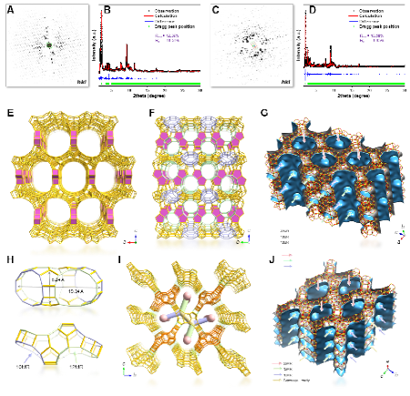 创制先进材料和阐明构效关系是化学、材料、物理、生物医药等物质科学发展的基础与核心。以沸石分子筛(zeolite)为代表的无机微孔材料由于其具有孔径分布均一、孔道结构规整、活性中心可调、比表面积大、稳定性好等特性,广泛用于绿色催化、吸附分离、离子交换等领域,多次引领能源、化工、环境领域里程碑式变革。新结构沸石分子筛的创制和应用是能源、化工、环境等众多领域技术变革的源头创新之一。但新结构沸石分子筛材料难设计合成且不易制备高质量单晶,其结构分析主要依赖于多晶粉末样品,因此,突破晶体尺寸和样品纯度对沸石分子筛材料结构分析的限制是新结构分子筛创制过程中的巨大挑战。