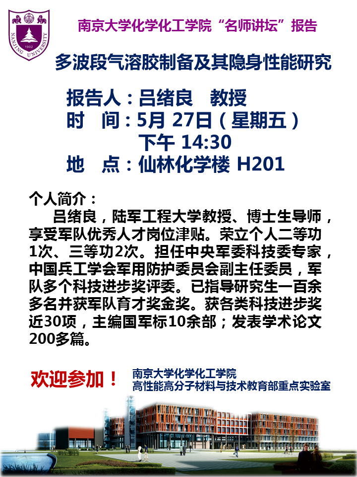5月27日名师讲坛-吕绪良教授:多波段气溶胶制备及其隐身性能研究