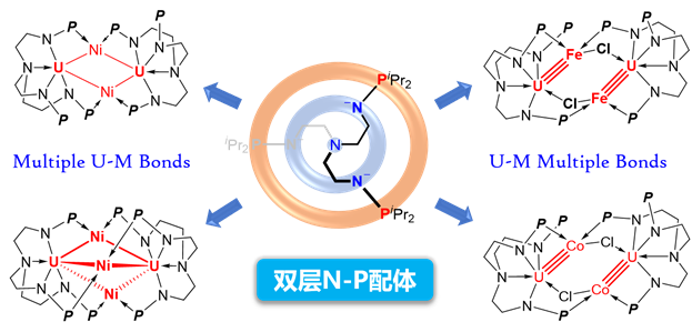 金属元素占据元素周期表的半壁江山,金属-金属键作为研究合金与金属分子配合物之间的桥梁载体,吸引了人们的极大关注。d区过渡金属之间的多重键得到飞速发展,为深入研究过渡金属的成键本质与潜在应用奠定了丰富的物质基础。相对而言,f区锕系金属参与的金属-金属键受限于合成方法少、产物稳定性差、难以表征等因素而发展缓慢。近年来,朱从青课题组采用独特的“双层N-P配体”,在锕系金属-金属键的构筑、反应性及性能等方面取得一系列原创性研究成果: