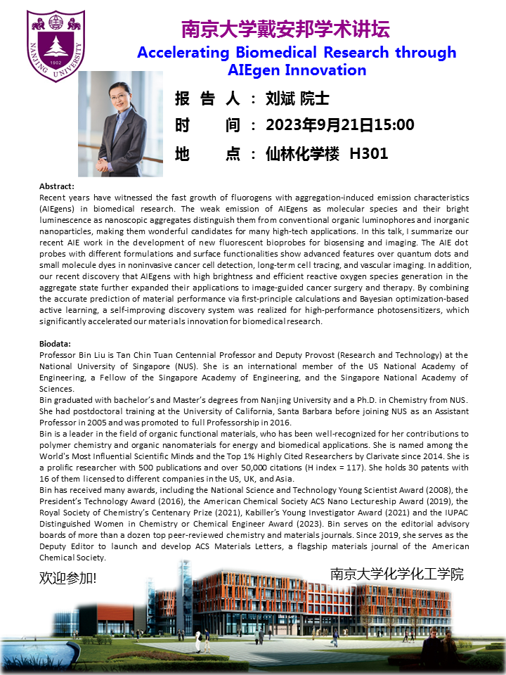 9月21日戴安邦学术讲坛-刘斌院士:Accelerating Biomedical Research through AIEgen Innovation