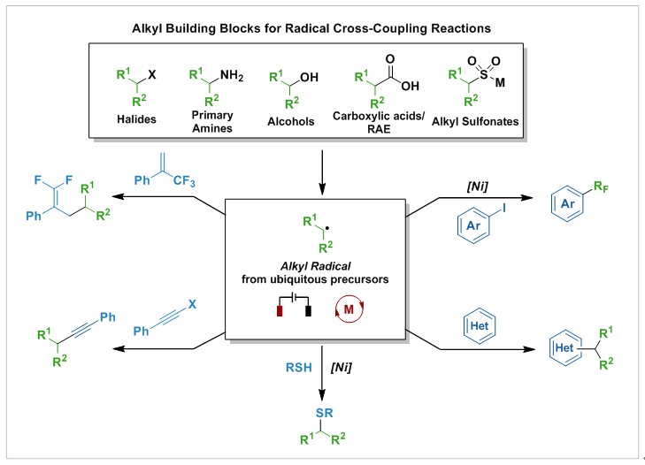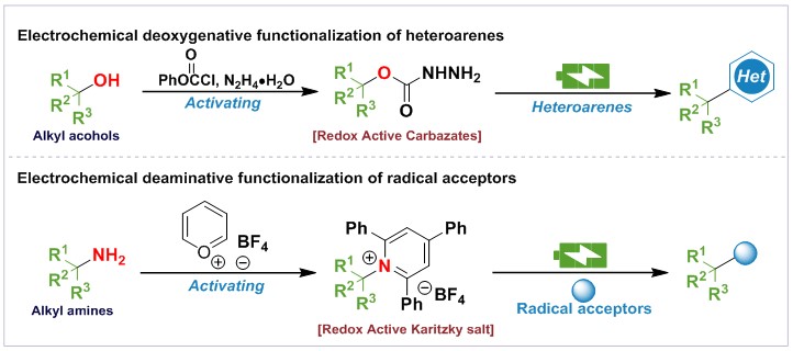 通过对羟基等官能团的活化实现对天然丰度来源广泛的化合物的碳骨架的利用。2020年,课题组报道了电化学脱氧产生烷基自由基,进行Minisci反应的研究工作,并发表于Agnew. Chem. Int. Ed, 2020, 59, 10859。