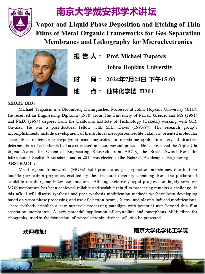 7月24日戴安邦学术讲坛-Prof. Michael Tsapatsis: Vapor and Liquid Phase Deposition and Etching of Thin Films of Metal-Organic Frameworks for Gas Separation Membranes and Lithography for Microelectronics