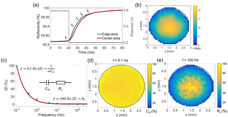 图2 (a) 金电极边缘和中心区域随电势变化的光学反射率曲线。(b)从反射率曲线中提取的时间常数的平面分布图。(c) 计算的得到的光学阻抗值与频率的 Bode 图,图内为拟合的等效电路图。(d) 0.1 Hz下和 (f) 100 Hz 下由阻抗模值计算得到Cdl和Rs的平面分布图。