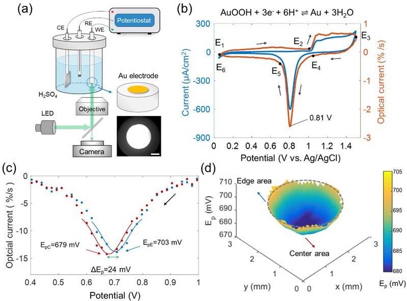 图1 (a)反射光学显微镜成像传统三电极体系的示意图。(b) 测得的金电极在硫酸溶液中的电学循环伏安曲线(蓝色曲线)以及整个电极的反射率微分之后得到的光学循环伏安曲线(橙色曲线)。(c) 电极边缘和中心区域还原过程的光学CV曲线。(d) 电极表面各个位置还原峰电势的三维分布图。