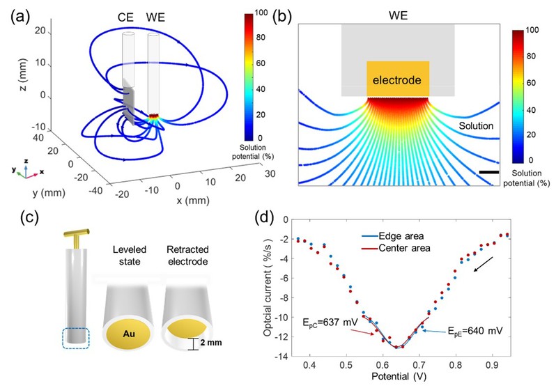 图3 (a) COMSOL模拟的工作电极和对电极之间电场线的三维分布图。(b)工作电极附近电势分布的截面图。(c) 使用的伸缩电极的示意图,包括两种模式,正常模式和回缩模式。(d) 回缩状态下,金电极边缘和中心区域的光学伏安曲线。