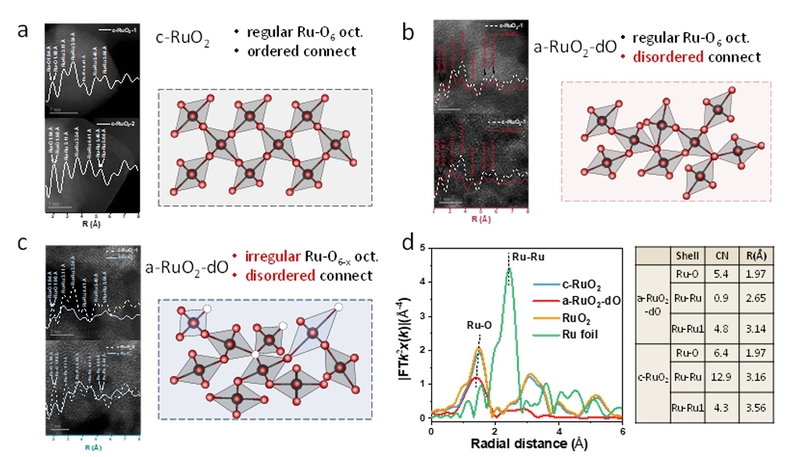 3. c-RuO2a-RuO2-dO的结构分析。(a)晶态氧化钌的相位对比校正高分辨透射电镜(HRTEM)的径向分布函数(RDF)分析,右侧为相应的Ru-O结构示意图。(b)非晶态RuO2HRTEMRDF分析,右侧为无序连接的规则Ru-O6八面体的示意图。(c)非晶态RuO2HRTEMRDF分析,右侧为无序连接的不规则Ru-O6八面体的示意图。(da-RuO2-dOc-RuO2的扩展X射线吸收精细结构(EXAFS)光谱,表格展示了不同样品在Ru K边的EXAFS拟合参数。