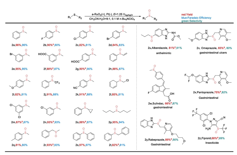 在电化学氧化方法中,基于分子基氧化还原媒介体生成的氧活性物种可通过均相催化过程实现硫醚的氧化。然而,均相过程中存在的分离回收等额外成本,严重限制了它们的进一步应用(图1b,左图)。分子基催化媒介由于其稳定性和反应性方面的内在限制,存在工作电化学电位窗口较窄的问题。当需要高电流密度和流动池配置以实现可扩展的化员工产时,这些问题尤为突出。直接电催化氧化策略用于选择性氧化甲基苯基硫化物可以有效避免上述问题。其中,水分子的表面活化是十分关键的步骤,该过程提供绿色氧原子插入反应物分子中。但是,与均相催化相比,非均相的直接电有机氧化策略通常在非水有机反应介质中遭受缓慢的单电子转移(SET)和氧(水活化)动力学,导致严重的过电位,目前尚未实现所需的反应活性和选择性(图1b,右图)。这些动力学障碍导致了许多问题,包括低电流密度、低选择性和低法拉第效率,阻碍了电有机氧化的广泛应用,尤其是在电催化硫化物到亚砜的转化中(图1c,左图)。