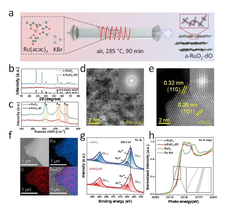 2. a-RuO2-dO的制备与表征。(aa-RuO2-dO的合成过程示意图。(bc-RuO2a-RuO2-dOXRD图谱。(cc-RuO2a-RuO2-dO的拉曼光谱。(da-RuO2-dO的球差校正HAADF-STEM图像(d)和c-RuO2e),插图显示相应的选区电子衍射图。(fa-RuO2-dOSEM图像和元素映射结果。(gc-RuO2(上)和a-RuO2-dO(下)的Ru 3p XPS分析。(ha-RuO2-dOc-RuO2和标准样品的Ru KXANES光谱。