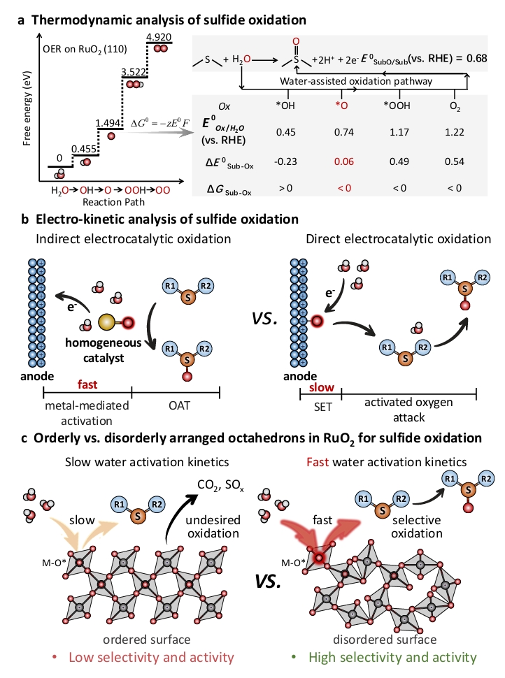 1. 利用水作为氧源的高效硫化物到亚砜电氧化的设计原则。(a)通过水活化途径硫醚氧化的热力学分析。(b)硫醚到亚砜转化的间接(左)和直接(右)电催化氧化的示意图及动力学分析。(c)不同RuO结构中有序(左)和无序(右)排列的Ru-O6八面体的示意图,用于加速电氧化动力学。规则的晶体表面通常表现出缓慢的水分子活化动力学,在有机介质中活性较低(左);相比之下,a-RuO-dO结构中无序排列的Ru-O6八面体显著加速了有机介质中的水氧化动力学,从而实现了硫化物的高效且选择性的直接电氧化。