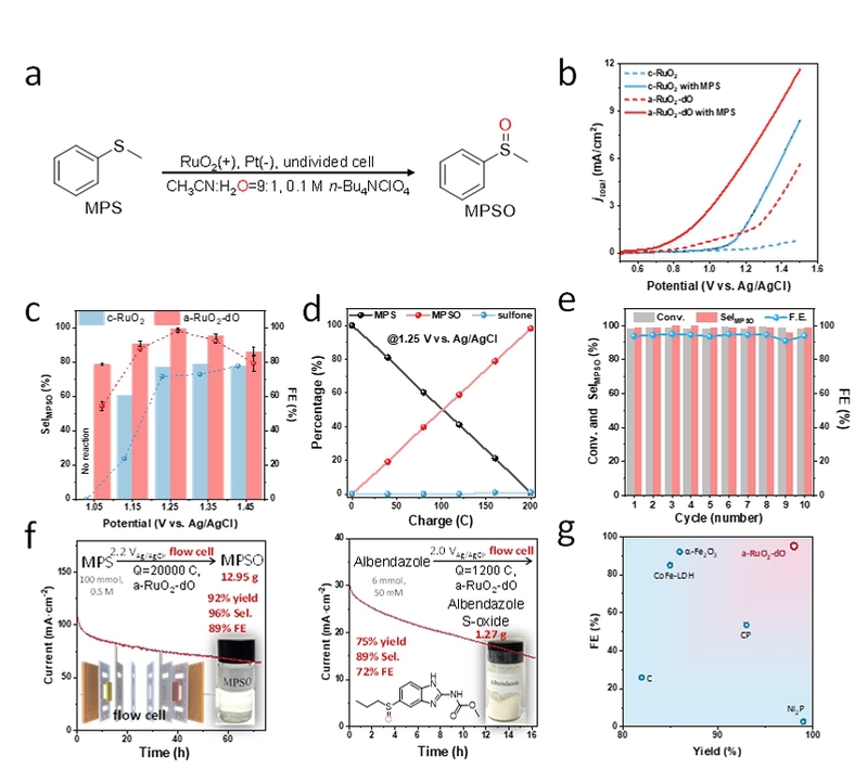 4. 硫化物选择性氧化为亚砜的电催化性能。(a)模型反应条件,RuO2代表c-RuO2a-RuO2-dO催化剂。(ba-RuO2-dOc-RuO2的线性扫描伏安法(LSV)。(c)在不同施加电位下使用a-RuO2-dOc-RuO2进行MPSMPSO转化的法拉第效率(FE)和选择性。(dMPSMPSO和砜的百分比与消耗电荷之间的关系。在完成一个标准反应循环后,更换电解液,并使用相同催化剂开始新的电解循环。每个循环对应约25小时的电解。(f)克级反应(g)与最先进的非均相电催化硫化物氧化反应的产率和法拉第效率的比较。(c)中的误差条表示多次反应的标准偏差(n=3)。