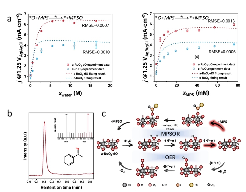 5. a-RuO2-dO的机理研究。(aa-RuO2-dOc-RuO2催化剂的微动力学分析,左图显示水依赖的动力学,右图显示MPS依赖的动力学。数据点表示实验部分电流密度(相当于高法拉第效率下的反应速率)对水/底物浓度的依赖关系,虚线曲线表示动力学数据的数学拟合。底部显示的反应速率方程是从微动力学模型的构建中得出的。(a)中的误差条表示多次反应的标准偏差(n=3)。(b)在CH3CN-18O标记的水和CH3CN-水中的MPS电氧化的MPSO质谱。(c)在a-RuO2-dO上直接硫化物到亚砜氧化(MPSOR)和氧析出反应(OER)的吸附物演化机制(AEM)的提出。