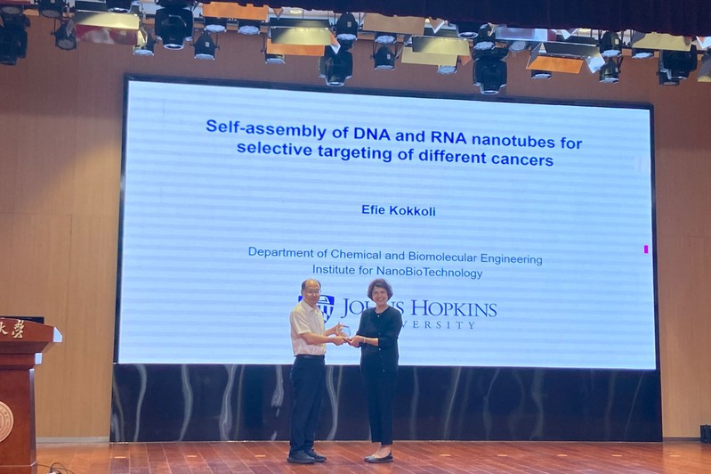 2024年7月24日下午,约翰斯·霍普金斯大学Efie Kokkoli教授应邀作为太阳集团tcy8722“名师讲坛”嘉宾,为公司师生作了题为“Self-assembly of DNA and RNA nanotubes for selective targeting of different cancers”的精彩报告。本次报告由太阳集团tcy8722李金波教授主持。李金波教授介绍了Efie Kokkoli教授的简历和成就,太阳集团tcy8722经理黎书华教授向Efie Kokkoli教授颁发了“名师讲坛”纪念铭牌。公司多个学科的教师、员工参加了报告会。