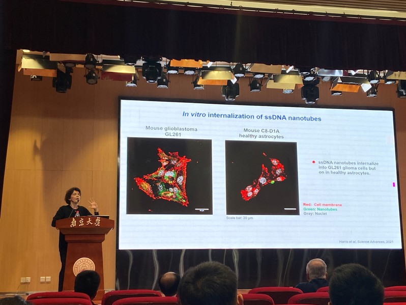 Efie Kokkoli教授首先概述了核酸纳米颗粒体系的特点与优势,介绍了现有的构建策略。其中,两亲物自组装是一类便捷高效的技术。Efie Kokkoli教授为大家讲述了如何将该方法应用于ssDNA及anti-microRNA纳米管的自组装,并详细说明了核酸两亲物中各组分的功能与纳米管的生长机理。之后,Efie Kokkoli教授结合不同案例介绍了课题组对核酸纳米管的结构优化,展示了其良好的药物负载功能及治疗效果。结果显示,ssDNA纳米管可靶向癌细胞并用于递送不同种类的药物;anti-microRNA-21纳米管可高效减少癌细胞的侵袭,并促使巨噬细胞重新极化从而有助于抗肿瘤治疗。此外,二者均可成功穿越血脑屏障,对传统治疗手段预后并不理想的胶质母细胞瘤具有良好的治疗效果。