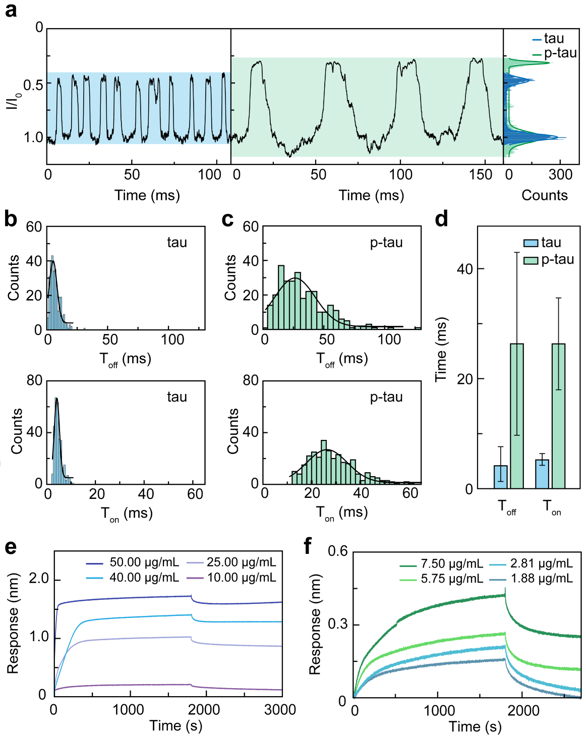 图2. 仿生突触纳米孔道监测tau蛋白、磷酸化tau蛋白与模型突触囊泡亲和性差异
