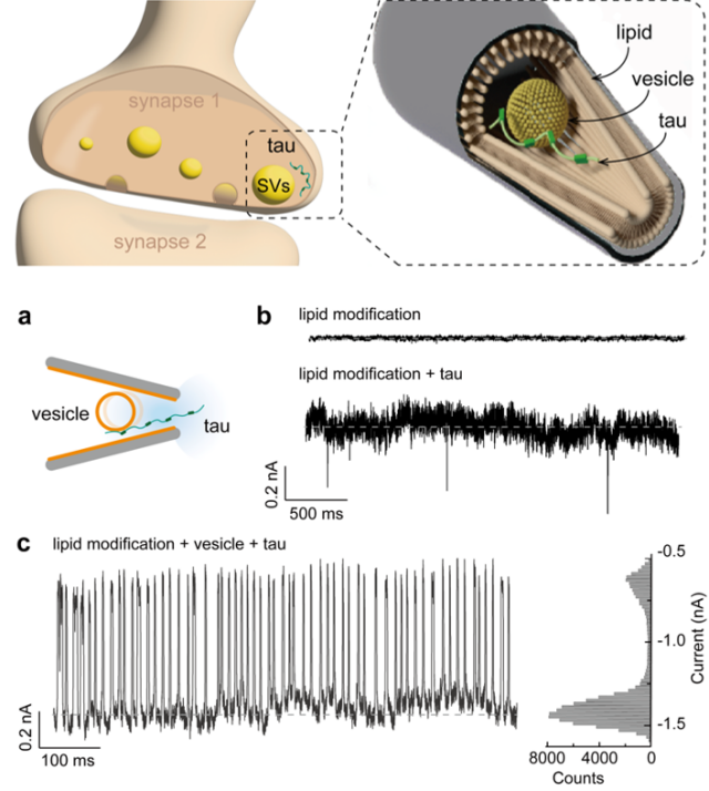 图1. 仿生突触纳米孔道监测Tau蛋白刺激下囊泡运动行为的变化