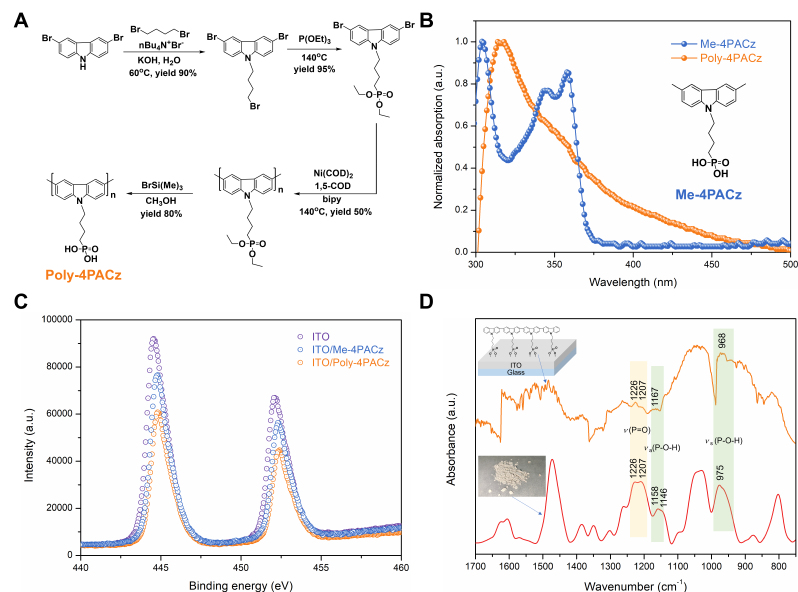 针对这些问题,太阳集团tcy8722陈尚尚课题组开发了首例新型聚咔唑磷酸(Poly-4PACz)空穴传输材料,合成路线见图1。该材料通过聚合咔唑磷酸小分子合成了一种新型HTM,所得Poly-4PACz与目前流行的小分子PACz HTMs相比具有几个关键优势。首先,与依赖于形成致密超薄SAM层的小分子PACz HTM不同,Poly-4PACz具有良好的导电性,因此对涂层厚度和TCO表面粗糙度不敏感,Poly-4PACz的磷酸基团不仅与TCO形成化学键,而且能够钝化钙钛矿层,抑制钙钛矿活性层/空穴传输层界面处的电荷复合。