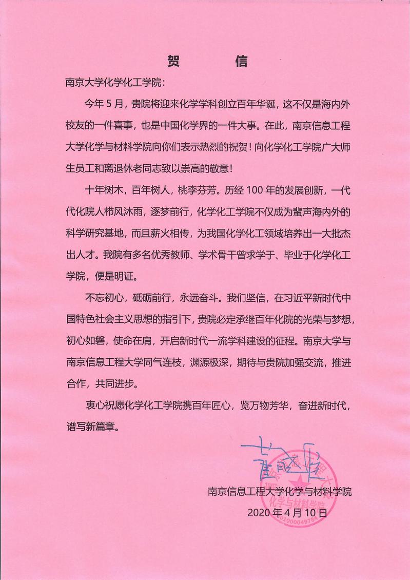 南京信息工程大学化学与材料公司为学科庆典发来贺信
