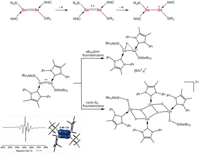 以上均属于非金属自由基物种。相对而言,主族金属的稳定自由基发展较缓慢,而基于主族金属-金属键的自由基更是稀少。 王新平课题组在前几年分别合成了主族金属锑的阳离子自由基(Angew. Chem. Int. Ed., 2017)和阴离子自由基(Angew. Chem. Int. Ed. 2019)后,今年利用氮杂环卡宾稳定并分离了首例主族镓金属的阳离子自由基及双阳离子。烯烃阳离子([C=C]•+)及双阳离子[C=C]2+是有机合成中的重要中间体,可以被稳定分离, 而主族金属类烯烃阳离子自由基却不稳定。但该课题组通过对双镓烯化合物进行单电子氧化及两电子氧化,成功得到双镓烯阳离子自由基化合物和双阳离子化合物(图4)。 通过电子顺磁共振和自旋密度分布图发现阳离子自由基中的自旋密度主要分布在两个镓原子上。他们发现双镓烯阳离子自由基盐具有很高的化学活性。通过与三正丁基锡化氢反应得到夺氢产物,而自由基盐和硫单质反应得到了首例含阶梯状Ga4S4核的双阳离子化合物,该化合物有可能作为合成硫化镓材料的单分子前体。 这项成果以Stable Radical Cation and Dication of an N‐Heterocyclic Carbene Stabilized Digallene: Synthesis, Characterization and Reactivity为题发表在(Angew. Chem. Int. Ed. 2020, DOI: 10.1002/anie.202000051)。博士研究生冯钟涛为论文第一作者, 谭庚文教授(苏州大学自由基功能材料研究中心)及王新平教授为通讯作者。