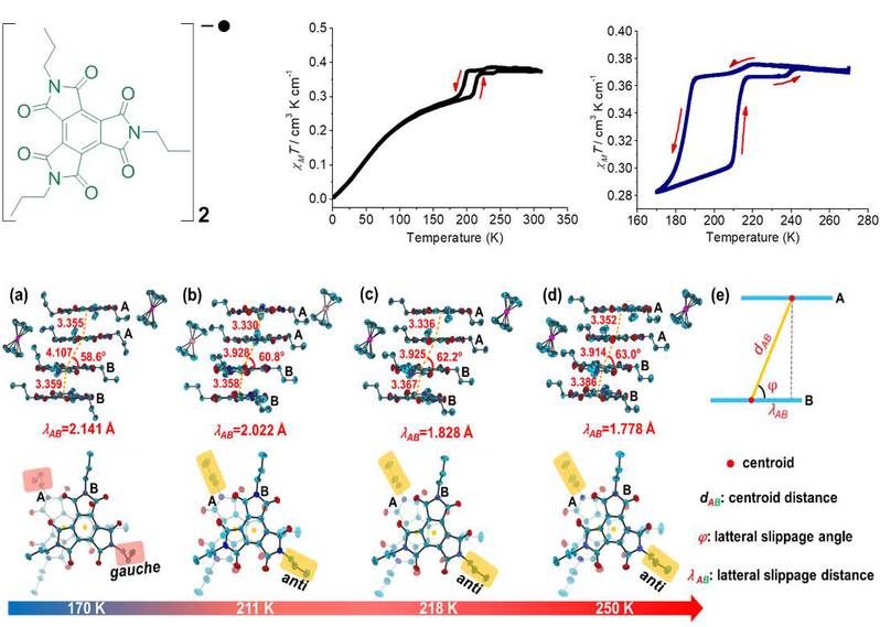 内电子耦合产生磁性双稳态(JACS,2016)。最近,该课题组跟中科院北京化学所王德先研究员课题组合作发现阴离子自由基磁性多稳态现象。他们通过对苯酰亚胺还原,得到了阴离子自由基。晶体结构表明阴离子形成(AA)1-和(BB)1-两种形态并成π-π层叠排列。磁性测试发现在不同的温度区间(220-242 K和170-210