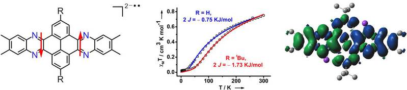 有趣的是,如果在上面分子中用氮原子取代硫原子,两次还原之后却只得到单线态双自由基。氮杂并苯类化合物由于其结构的独特性、性质的可调控性以及在有机场效应晶体管(OFETs)、有机光伏器件(OPVs)和有机发光二极管(OLEDs)中的潜在应用而受到广泛关注。对这类化合物的氧化还原性质的研究将有助于它们在以上领域应用的研究。人们已经分离出了一系列氮杂并苯闭壳层双阴离子,而氮杂并苯双自由基双阴离子未报道。我们利用KC8分别对两例芘联氮杂并苯衍生物 (图3)进行两倍还原,成功分离得到了 双阴离子双自由基。通过X-射线单晶衍射测定了他们的单晶结构,并利用紫外可见光谱(UV-Vis)、电子顺磁共振(EPR)和超导量子干涉仪(SQUID)等表征手段以及DFT 量化计算,磁学性质研究结果表明双阴离子的基态均为开壳层单线态,且单线态-三线态能量差很小,容易热激发为三线态。该成果以“Crystalline Diradical Dianions of Pyrene-fused Azaacenes”为题,发表于《德国应用化学》(Angew. Chem. Int. Ed. 2020, DOI: 10.1002/anie.202001842)。博士生陈超为论文第一作者,苏远停副教授(苏州大学自由基功能材料研究中心)和王新平教授为通讯作者。