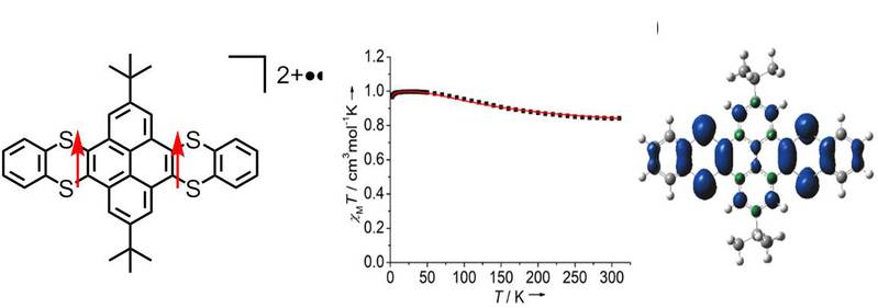 然而,含硫双自由基可以通过芘桥基的双噻蒽硫杂稠环烃的氧化获得。近期,该课题组设计合成了一种全新的双噻蒽硫杂稠环烃(图2)。循环伏安研究表明,这种化合物可以实现可逆的两倍氧化反应。在电化学研究的基础上,使用氧化剂NO[Al(ORF)4](ORF=OC(CF3)3)对该化合物进行两倍氧化,成功分离得到了 双自由基双阳离子盐。 电子顺磁共振(EPR)图谱显示了零场分裂(ZFS)和强烈的半场信号,表明存在较强的分子内相互作用。超导量子干涉(SQUID)表明基态为三线态,单-三线态能量差2J = 174 K,是首例高自旋硫杂稠环烃双自由基。高自旋有机分子在化学反应和功能材料领域受到了人们的广泛关注。其中,硫杂开壳层稠环烃在电子学和磁学领域有着重要意义。但目前报道的高自旋双自由基(S = 1)多是基于C/N/O的有机双自由基,有关含硫双自由基的报道则十分少见。迄今为止,所有报道的含硫三线态双自由基都含有起稳定作用的N元素,而三线态硫杂稠环烃双自由基则从未被报道过。 该成果以“A Magnetically Robust Triplet Ground State Sulfur-Hydrocarbon Diradical Dication”为题,发表于《美国化学会志》(J. Am. Chem. Soc. 2020, 142, 7340−7344)。博士生唐树轩为论文第一作者,王新平教授为通讯作者。
