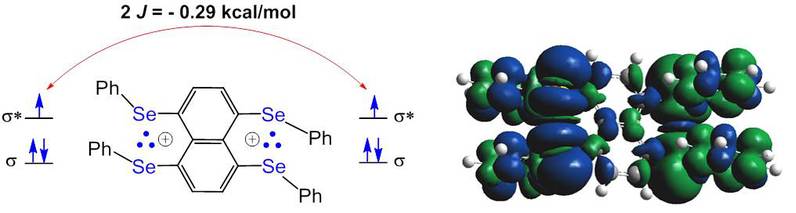 三电子σ-键的概念最早由Linus Pauling 于1931年提出,是自由基化学、生物化学、有机反应、光化学等等领域的重要中间体,如阿尔茨海默病(Alzheimer’s Disease, 又称早老性痴呆症)的病理形成过程中就涉及含S∴S, S∴N或S∴O等三电子σ键中间体。 近几年本课题组合成了稳定的含Se∴Se(Nat. Commun. 2014),S∴S (JACS, 2014),Co∴Co (Angew. Chem. Int. Ed. 2015),以及Co∴Cr (JACS, 2017)三电子键自由基化合物。在此基础上,最近本课题组得到了首例基于奇数电子键的双自由基化合物(图1)。他们首先设计通过奈环桥基的四苯基四硒化合物,经过两次化学氧化,生成两价阳离子。研究表明,该阳离子具有开壳层双自由基结构,两个Se-Se三电键之间存在反铁磁作用(-0.29 kcal/mol)。有趣的是, 类似的硫类似物却形成平面闭壳层结构。此工作扩展了人们对于三电子键以及双自由基的认识。论文发表在Nat. Commun. (“A Diradical Based on Odd-Electron σ-Bonds”,DOI: 10.1038/s41467-020-17303-4),硕士生杨闻邦、广西科技大学的张莉博士和南京工业大学肖邓孟非为第一作者,赵莉莉教授(南工大), Gernot Frenking 教授 (德国Philipps-Universität Marburg大学)和王新平教授为通讯作者。