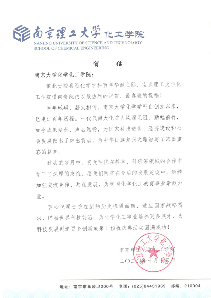 南京理工大学化工公司贺信