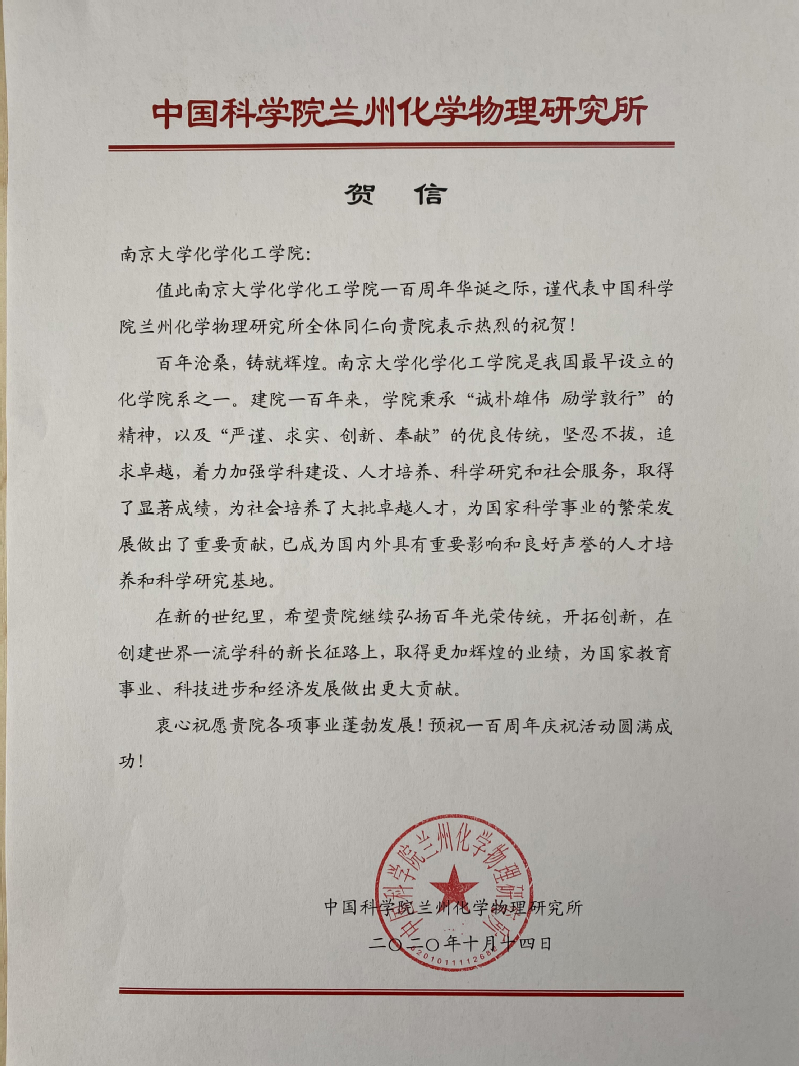 中国科公司兰州化学物理研究所贺信