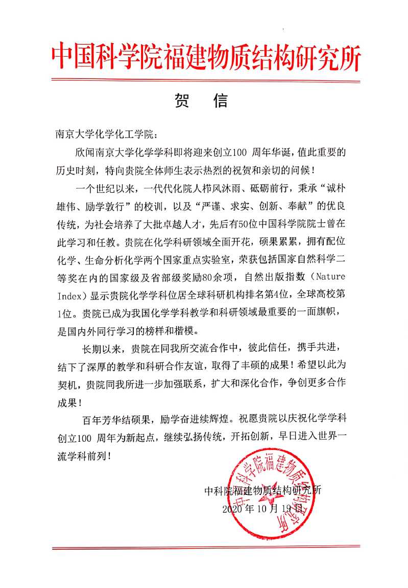 中国科公司福建物质结构研究所贺信