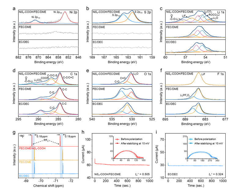 NiS4-COOH添加剂可以极大地改变电解质中的离子配位环境。这主要是因为NiS4-COOH中的配位不饱和镍原子可以作为路易斯酸位点与带负电荷的PF6-产生强相互作用,使得部分PF6-从锂离子的溶剂化壳层移出。PF6-的移出能有效的抑制PF6-在锂金属表面被分解而产生有害的HF气体。此外,NiS4-COOH分子和PF6-之间的相互作用也在一定程度上限制了PF6-在电解液中的迁移,这使得改性电解液的锂离子迁移数增大,电极/电解质界面处的锂离子浓度梯度得到改善,进一步促进锂离子的均匀沉积。