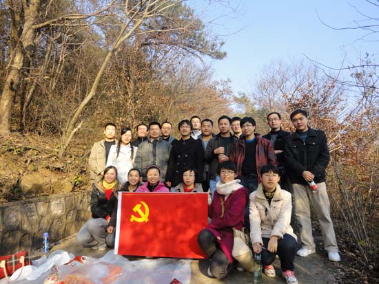 为迎接2011级无机博士新生,并促进新老博士以及各实验室之间博士们的交流与学习,2011年12月3日下午,在黄伟和曹登科老师的组织下,无机博士第一、二党支部将组织生活联合搬至户外,举行了无机博士党员攀登紫金山的活动。 临行前,大家在唐仲英楼集合,跟党旗一起合影留念。