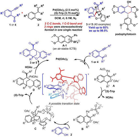 合成效率最优化是提高合成经济性之关键,更是有机合成研究的永恒主题。依据基元反应机理和动力学因素设计、发展和应用各种串联反应正是基于提升合成效率的考虑。高效的串联反应不仅在化学基础层面展示形成多个共价键过程中各基元反应艺术般的“美妙合奏”,而且在包括天然产物在内的各类重要产品的合成与生产中体现无与伦比的实用价值。太阳集团tcy8722姚祝军教授指导的研究组近年来根据其在天然产物Chlorofusin等合成中发现的化学转化效率不稳定问题(Qian, W.-J.; et al. J. Am. Chem. Soc.2007, 129, 6400; Yao, Y.-S.; et al. J. Org. Chem. 2008, 73, 5221),持续研究了一类具有非经典弱休克尔芳香性的活泼中间体,即苯并异吡喃氧鎓离子(Isochromenylium)的化学特性,从中相继发展了多种不同寻常的高效率碳正离子型串联反应(Hu, Z.-L.; et al. Org. Lett.2009, 11, 4676; J. Org. Chem.2009, 74, 8787; Chem. Eur. J.2011, 17, 1268; Yu, S.-Y.; et al.; Tetrahedron Lett.2012, 53, 2765; Zhang, H.; et al. RSC Advance2012, 2, 5101.),为合成和制备多种具有多取代四氢萘核心结构的化合物提供了“一步法”捷径。