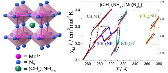 ![]() 王新益课题组还获得了一系列以有机胺阳离子(甲胺,二甲胺,三甲胺,四甲胺)为模板、由叠氮桥连Mn2+所形成的金属-有机钙钛矿结构。和无机钙钛矿化合物类似,这类化合物在室温附近全部具有热致的结构相变。相变前后的结构均通过单晶X射线衍射实验、差热分析、磁性测量等加以证实。伴随着结构相变,其磁化率在室温附近具有随温度的滞回曲线,而且磁有序温度及磁性双稳态温度均可由阳离子进行调控。这为设计合成室温双稳态材料及多功能磁性化合物提供了思路(J. Am. Chem. Soc.2013, DOI: 10.1021/ja407654n)。南京师范大学的卫海燕教授对本工作中的理论计算部分提供了帮助。