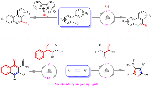 俞寿云课题组和张艳课题组利用各自在有机合成化学和有机光化学领域的经验和积累,合作在可见光促进的氧化还原反应领域进行探索,近期取得了系列进展。他们利用光敏剂经可见光激发跃迁后所具有的还原性,实现了多种多取代芳香化合物新的合成方法。例如,利用异氰作为自由基受体来制备多取代菲啶(Angew. Chem. Int. Ed.,DOI:10.1002/anie.201308376)。该反应是第一例利用可见光促进的自由基异氰插入反应,与传统的自由基异氰插入反应相比,由于整个催化循环过程是氧化还原中性的,因此无需添加当量氧化剂,同时也避免了高毒性的有机锡试剂的使用,是一种温和、高效的制备6位烷基化菲啶衍生物的方法。他们还实现了6位三氟甲基化的菲啶衍生物的简洁的合成方法(Org. Lett., 2013, 15, 5520)。与此同时,他们还报导了一种利用1,3-二羰基溴代物在光氧化还原催化条件下来制备多取代呋喃及多取代2-萘酚的方法(Org. Lett., 2013, 15, 4884)。 ![]() 图一、可见光促进的多取代芳香化合物的合成