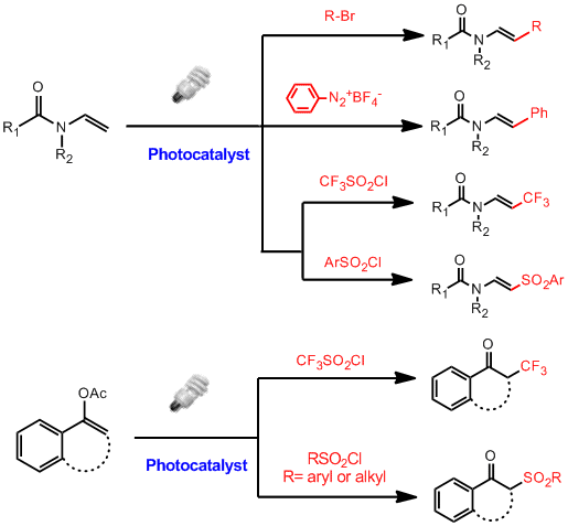 为了进一步扩展该类反应的实用性,他们还利用这一合成技术实现了一系列的碳氢键官能团化。碳氢键官能团化是目前有机合成领域非常具有挑战性的课题,已经实现的碳氢键官能团还有很大的局限性,比如使用导向基团,当量的氧化剂,亚当量的贵金属作为催化和很高的反应温度等。他们利用可见光促进的氧化还原反应实现了一系列的碳氢键官能团化,包括烯酰胺和烯醇酯的烷基化,芳基化,三氟甲基化和砜基化(Chem Eur. J., 2012, 18, 15158; Adv. Synth. Catal., 2013, 355, 809; Eur. J. Org. Chem., 2013, 5485 )。由于光催化剂既可作为还原剂来产生自由基物种,又可作为氧化剂来氧化自由基中间体生成产物,因此反应中无需加入当量的氧化剂或还原剂。由于自由基的高活性,该反应在室温下进行且无需严格无氧条件,操作简便,环境友好,因此,该方法为碳氢键的官能团化提供了一种新的解决方案。