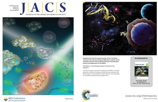 此外,该课题组还通过与公司生命科公司张辰宇教授研究团队的合作,积极探索由光活性分子的反应获取的新结构化合物在调控细胞内microRNA这一前沿研究方向上的应用。目前他们已经从基于光活性分子反应的新结构化合物中筛选得到了几类有重要调控活性的化学小分子。基于这些活性小分子构建探针开展的化员工物学研究也属于目前该领域研究的前沿,张艳教授和张辰宇教授就microRNA作为新型生物靶标的化员工物学研究撰写的综述也作为2014年第二期的封底(图3右)发表于颇具影响力的化学综述杂志 ( Chem. Soc. Rev. 2014, 43, 506-517)。 ![]() 图3 课题组所发表的封面及封底文章