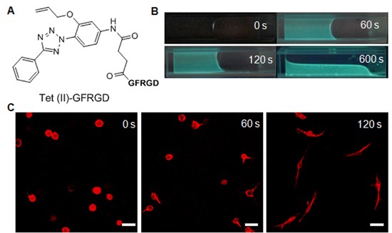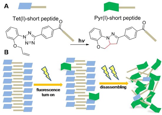 张艳教授课题组围绕光活性分子的反应和应用开展了多学科交叉的研究工作,最近在基于光活性分子的化员工物学研究取得了重要进展。该课题组近期在J. Am. Chem. Soc.上报导了一例基于光活性分子修饰的新型短肽光敏性超分子水凝胶(J. Am. Chem. Soc. 2013, 135, 18718-18721),在这项工作中,作者巧妙地使用一个可以在温和的光照条件下发生快速的分子内“光点击”反应的二芳基取代四氮唑分子作为“光扳机”。将此“光扳机”修饰在合成短肽的氮端,可以促使合成短肽分子在生物相容的环境下通过自组装形成机械性能很好的超分子水凝胶,该水凝胶在温和的光照条件下可被“光扳机”的迅速反应扰动,开启荧光发射及水凝胶的光降解等智能响应(图1)。 ![]() 图1 含有新型“光扳机”结构的小分子凝胶因子结构设计